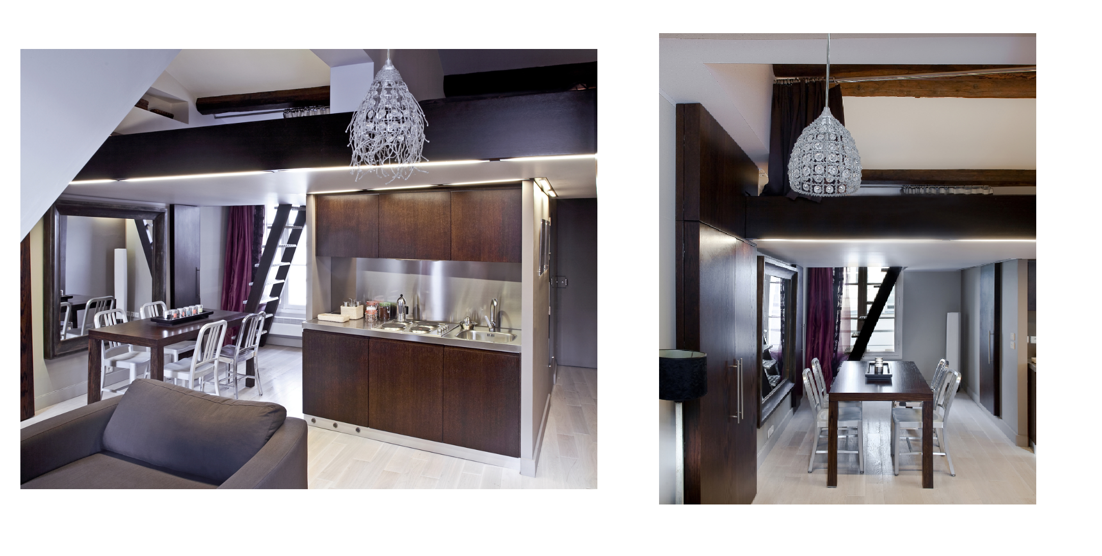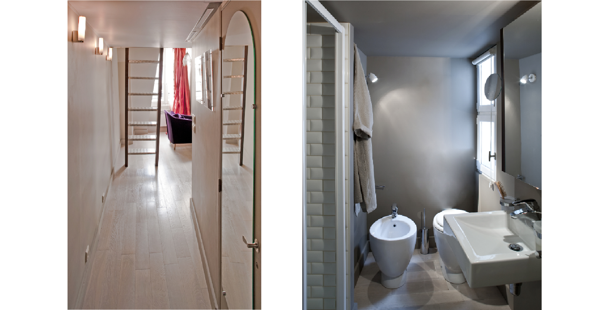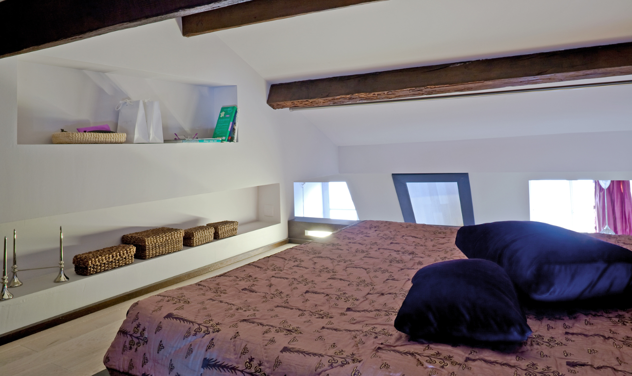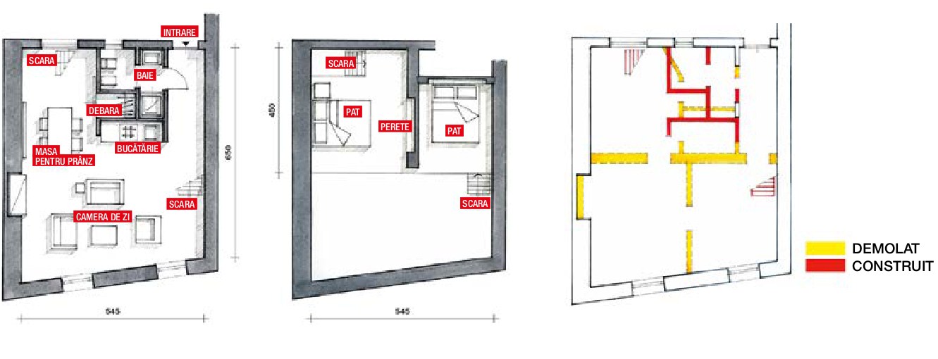 Un apartament mic de doar 35 de metri pătrați, împărțit în trei spații mai mici, cu facilități reduse, aproape își dublează spațiul prin anexarea la mansardă, devenind un apartament spațios, de 60 m2. Pentru a face acest lucru, a fost necesară demolarea planșeului inferior. În noua ordine, au fost eliminate, de asemenea, toate diviziile interne la nivelul inferior, făcându-se lucrările de consolidare necesare, respectiva zonă fiind în întregime gândită ca spațiu locuibil.
